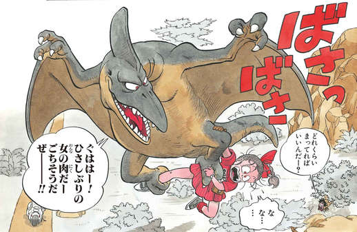 Pteranodon fesselt Goku und entführt Bulma, in der Absicht, die junge Dame als nächste Mahlzeit zuzubereiten. Goku springt auf Bulmas Motorrad und nimmt die Verfolgung auf, dann rettet er den Tag mit einem vernichtenden Nyoibo Schlag über seinem Kopf, der den schuppigen Bösewicht augenblicklich niederschlägt!