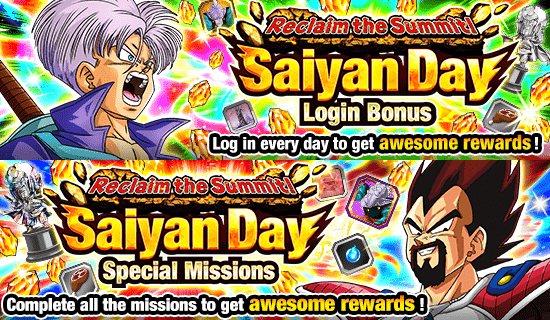Holen Sie sich Drachensteine und Trainingsgegenstände, mit denen Sie Ihre Charaktere durch den Anmeldebonus und die aktuellen Missionen stärken können! Melden Sie sich außerdem unbedingt am Saiyajin-Tag (18.03.) an, um 3+1+8=12 Drachensteine auf einmal zu erhalten! Darüber hinaus gibt es Inevitable Showdown! EXTRA-Missionen, in denen Sie Spaß daran haben, gegen beeindruckende Feinde zu kämpfen, neue Missionen zum Challenge-Event „Fighting Legend: Vegeta“ und vieles mehr! Melden Sie sich also unbedingt bei Dokkan Battle an und feiern Sie wie ein echter Saiyajin!