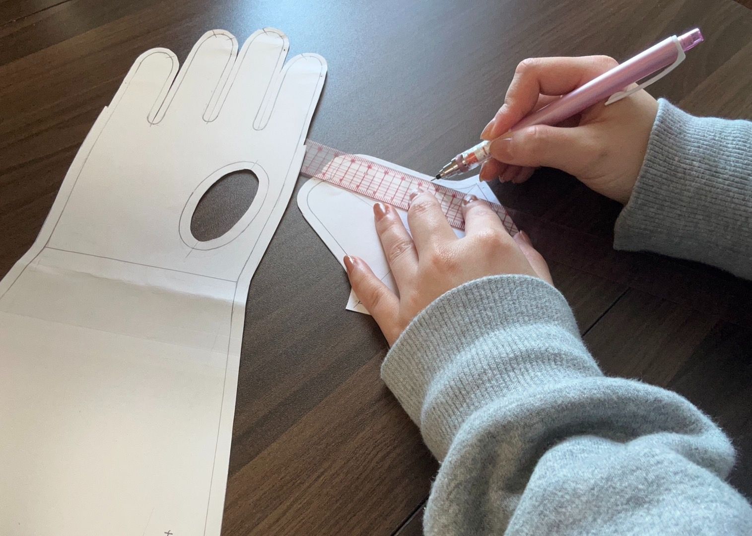Wieder einmal begannen wir mit der Erstellung des Musters. Diese Handschuhe bestehen aus vielen komplizierten Teilen, daher waren wir beim Zuschneiden jedes einzelnen Teils äußerst vorsichtig.