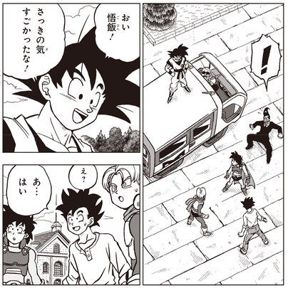 Mit dem Saiyaman-Duo im Schlepptau macht sich Carmine auf den Weg zu Gohans Haus. Als Gohan Carmine erblickt, ist er sofort kampfbereit und verwandelt sich in seinen Biestzustand.