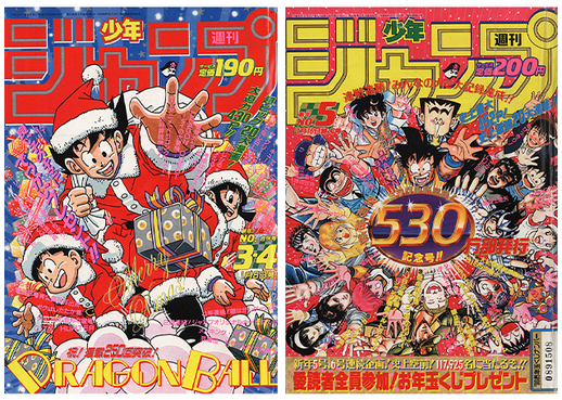 Goku tauchte weiterhin auf den Titelseiten von Shonen Jump auf, beispielsweise hier links, wo er dabei half, Weihnachten im Weihnachtsmannkostüm zu feiern, oder rechts, wo der Saiyajin in der Mitte erschien, um 5,3 Millionen verkaufte Exemplare des Magazins zu feiern!