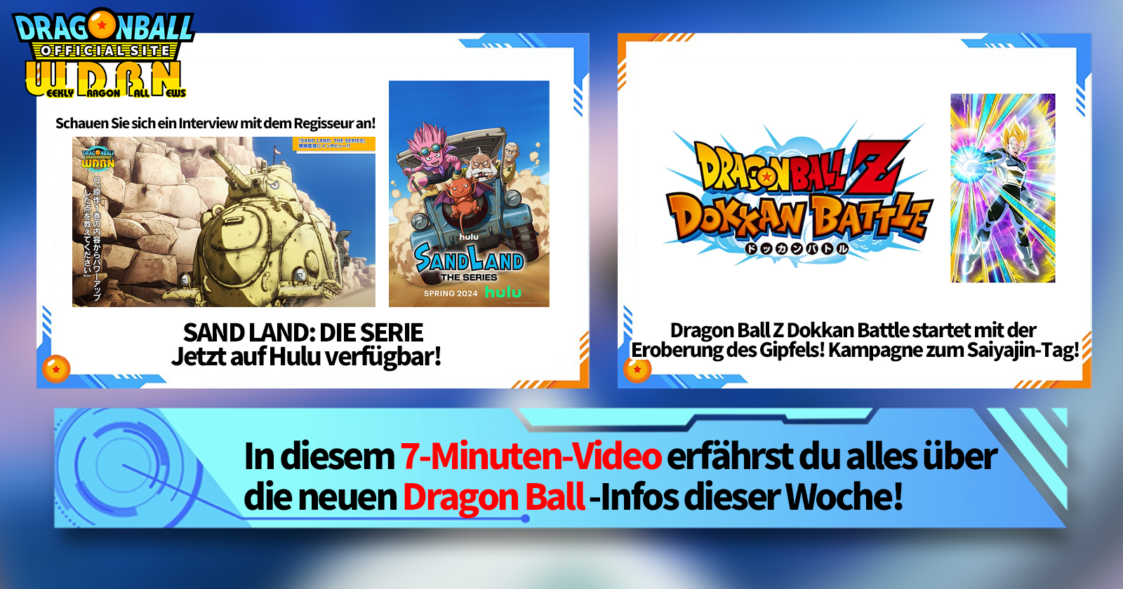 „Weekly Dragon Ball News“ ist eine Videoserie, die jeden Montag (JST) aktualisiert wird, um Ihnen die neuesten Nachrichten aus der Welt von Dragon Ball zu liefern! Begleiten Sie V Jump Redakteur Victory Uchida, wenn er über die heißesten Informationen der vergangenen Woche sowie über aktuelle Updates wie neue Produktinformationen und Website-Neuigkeiten für die kommende Woche berichtet!