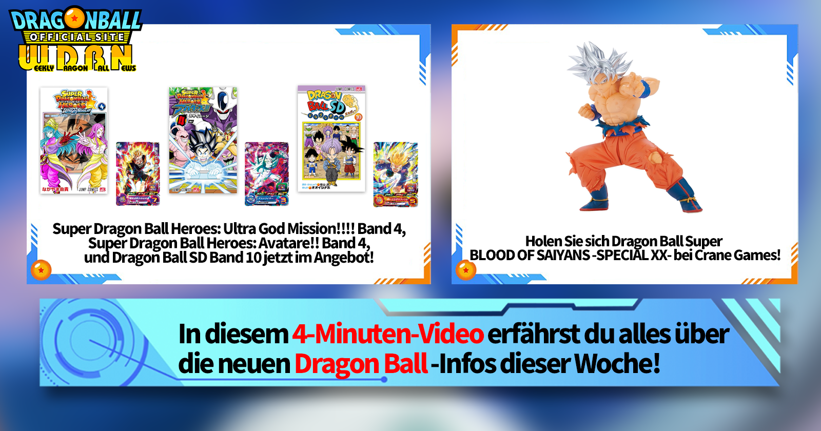 „Weekly Dragon Ball News“ ist eine Videoserie, die jeden Montag (JST) aktualisiert wird, um Ihnen die aktuellsten Nachrichten aus der Welt von Dragon Ball zu präsentieren! Begleiten Sie V Jump Redakteur Victory Uchida, wenn er über die heißesten Neuigkeiten der letzten Woche berichtet und aktuelle Updates wie neue Produktinformationen und Site-Neuigkeiten für die kommende Woche präsentiert!