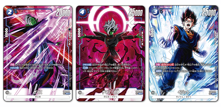 „Zamasu“ kann nicht durch die Fähigkeiten Ihres Gegners aus dem Kampfgebiet entfernt werden und verfügt über die Fähigkeit, dass Sie beim Angriff eine Karte aus Ihrer Hand ablegen und dann eine Karte ziehen.