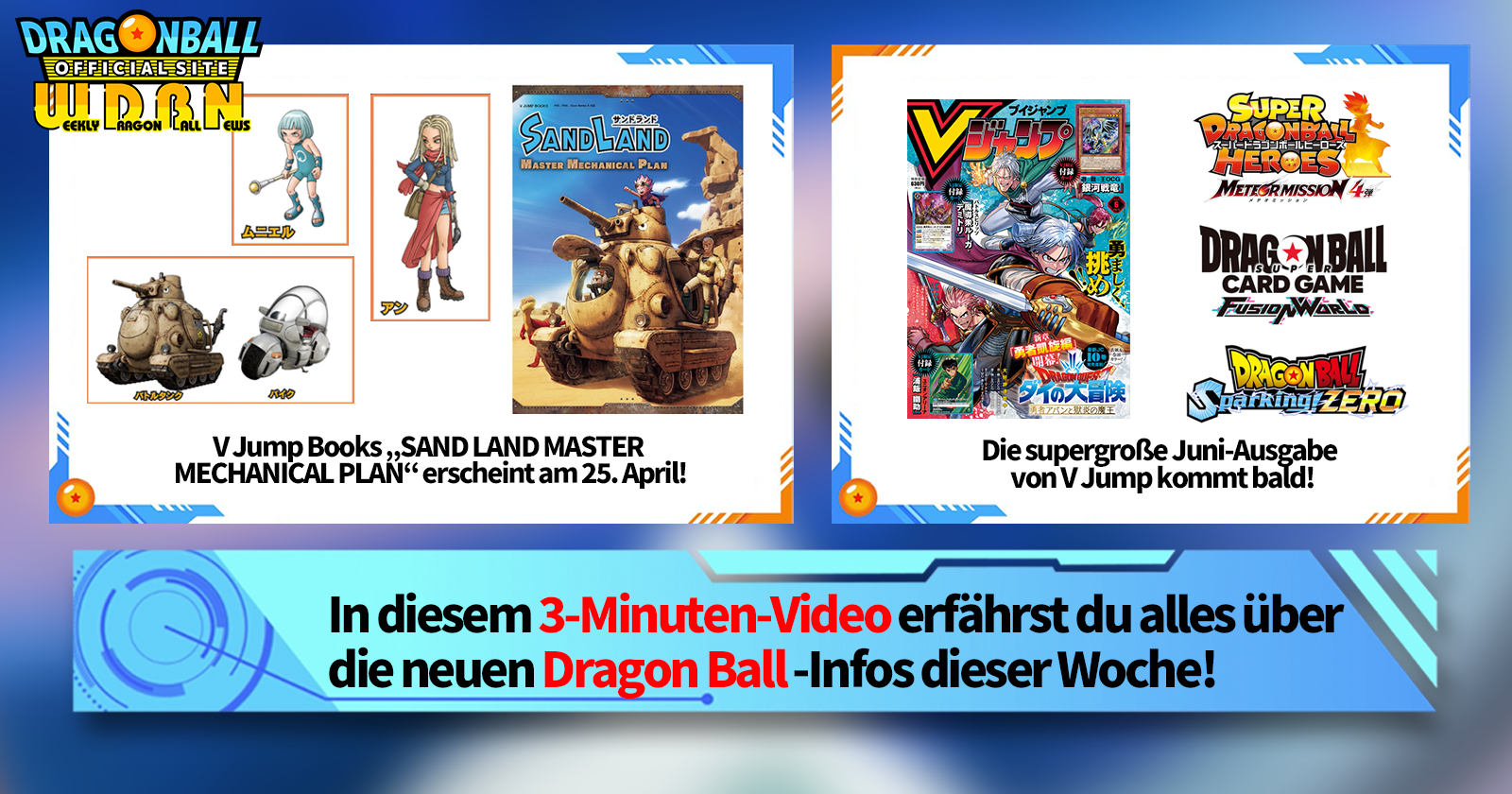 „Weekly Dragon Ball News“ ist eine Videoserie, die jeden Montag (JST) aktualisiert wird, um Ihnen die aktuellsten Nachrichten aus der Welt von Dragon Ball zu präsentieren! Begleiten Sie V Jump Redakteur Victory Uchida, wenn er über die heißesten Neuigkeiten der letzten Woche berichtet und aktuelle Updates wie neue Produktinformationen und Site-Neuigkeiten für die kommende Woche präsentiert!