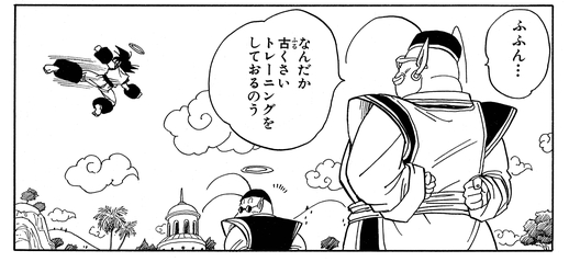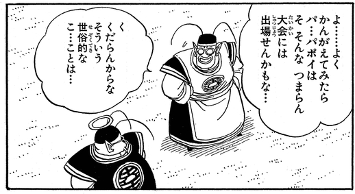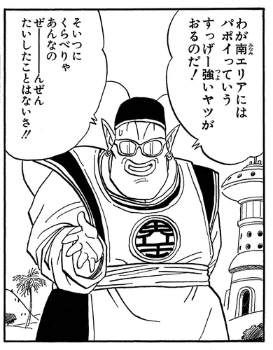 Als er den South Kai prahlen und poltern hört: „Auf den südlichen Planeten gibt es einen mächtigen Kämpfer namens Papoye! Er wird diesen Kerl zum Frühstück verspeisen!!“, schlägt der Kai des Nordens vor, Gokus Trainingsgewichte zu erhöhen.