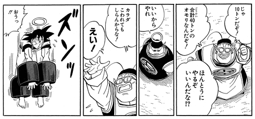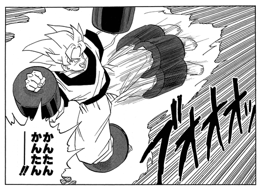 Als er sieht, wie Goku sich in einen Super Saiyan verwandelt und sein Training fortsetzt, wobei er ohne auch nur ins Schwitzen zu kommen insgesamt 40 Tonnen trägt, ist South Kai sprachlos.