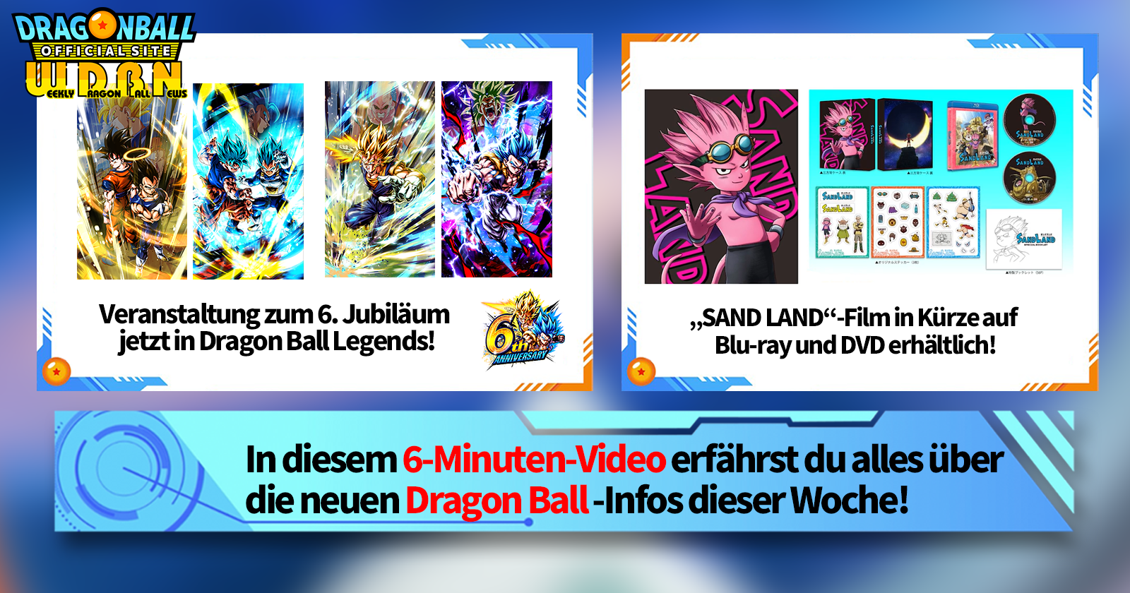 „Weekly Dragon Ball News“ ist eine Videoserie, die jeden Montag (JST) aktualisiert wird, um Ihnen die aktuellsten Nachrichten aus der Welt von Dragon Ball zu präsentieren! Begleiten Sie V Jump Redakteur Victory Uchida, wenn er über die heißesten Neuigkeiten der letzten Woche berichtet und aktuelle Updates wie neue Produktinformationen und Site-Neuigkeiten für die kommende Woche präsentiert!