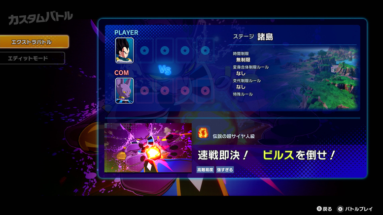 Der „Extrakampf“, den ich gespielt habe, war einer, in dem ich als Vegeta gespielt habe und kämpfen musste, damit Beerus sich nicht langweilt! Wenn Sie Beerus in diesem Kampf nicht alle 30 Sekunden 20 % Schaden zufügen, warnt Sie der katzenartige God of Destruction , dass ihm langweilig wird. Wenn Sie dann weitere 10 Sekunden lang keinen Schaden zufügen, erklärt Beerus , dass ihm zu langweilig ist, um den Kampf fortzusetzen, und beendet den Kampf mit einem ultrastarken Zug! Dieser Kampf war superschwer!