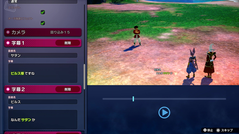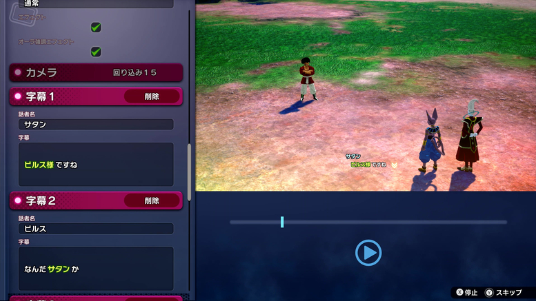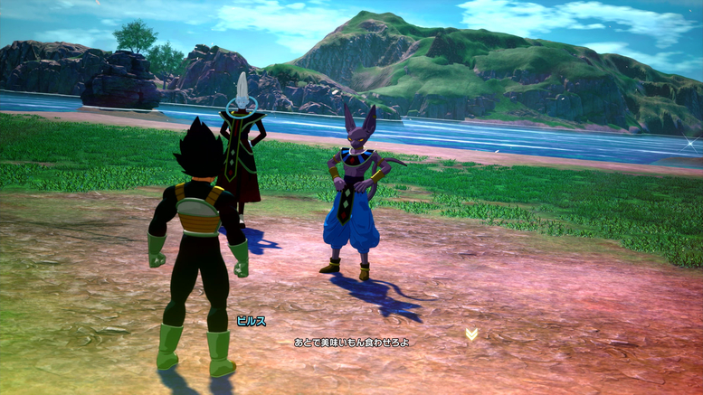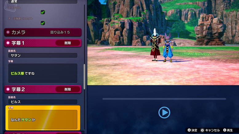 In „Extra Battle“ können Sie auch die erscheinenden Charaktere und ihre Zeilen ändern! Wie Sie auf den Fotos oben sehen können, wurde Vegeta durch Mr. Satan ersetzt, sodass er jetzt derjenige ist, der unter Beerus trainiert!