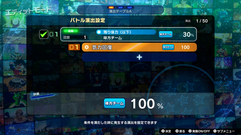 Sie können die Charaktere, die Kampfumgebung und sogar die Dinge konfigurieren, die passieren, wenn bestimmte Bedingungen erfüllt sind! Wie Sie auf den Fotos unten sehen können, erreicht das Ki des verbündeten Teams 100 %, wenn seine verbleibende Gesundheit unter 30 % fällt!