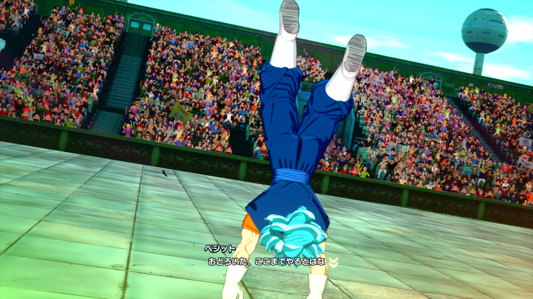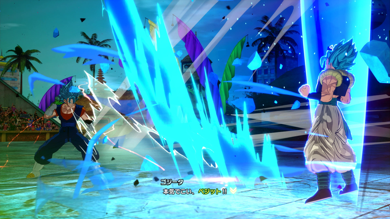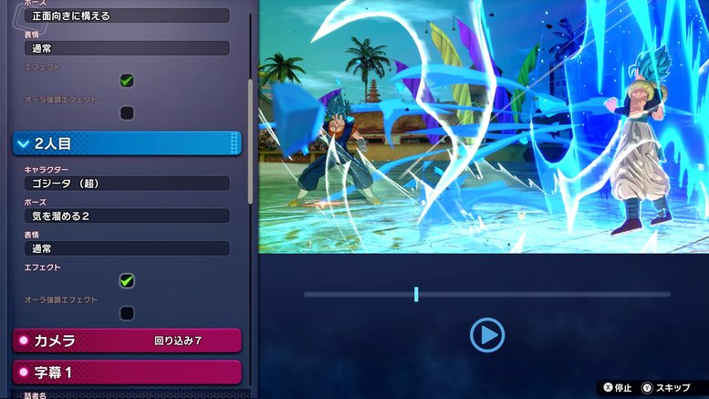Hier können Sie die Kameraführung, Posen und Ausdrücke konfigurieren, die verwendet werden, wenn Charaktere die Arena betreten. In der hier gezeigten Szene hat Vegito einen Rückwärtssalto gemacht, um etwas Abstand zu gewinnen, und ist nun bereit, während Gogeta Ki sammelt, um ihn zu provozieren!