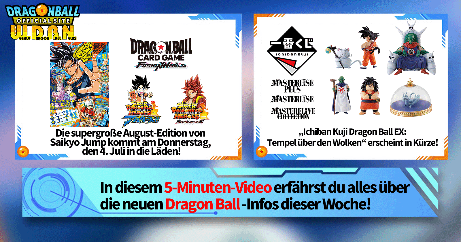 „Weekly Dragon Ball News“ ist eine Videoserie, die jeden Montag (JST) aktualisiert wird, um Ihnen die aktuellsten Nachrichten aus der Welt von Dragon Ball zu präsentieren! Begleiten Sie V Jump Redakteur Victory Uchida, wenn er über die heißesten Neuigkeiten der letzten Woche berichtet und aktuelle Updates wie neue Produktinformationen und Site-Neuigkeiten für die kommende Woche präsentiert!