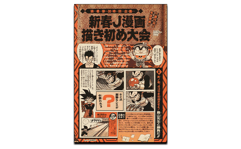 In dieser Ankündigung für den „Neujahrs-J-Manga-Zeichenwettbewerb“ wurde Vegeta in den ersten drei Panels dargestellt, wie er auf einer Bowlingbahn einen Strike erzielen wollte. Während Toriyama seine eigene Vorstellung davon hatte, wie das vierte Panel aussehen würde, war es den Teilnehmern überlassen, ihre eigenen Ideen einzubringen und das letzte Panel selbst zu zeichnen!