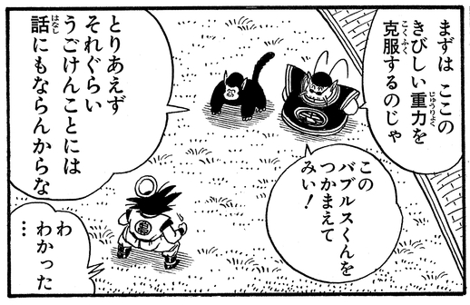Goku kommt zum Training unter dem Wortspiel liebenden Kai, sagt dem Krieger jedoch: „Bis du diese Schwerkraft überwinden kannst ... hat alles andere keinen Sinn!“ Dann lässt er Goku als erste Lektion versuchen, Bubbles zu fangen!