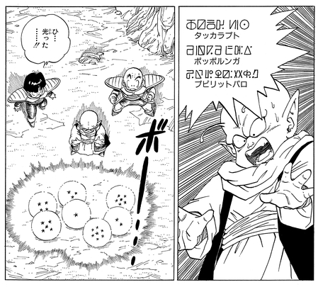 Nach einem erbitterten Kampf mit Frieza um alle Dragon Balls gelingt es Krillin und Gohan dank Dendes Hilfe, Porunga zu beschwören.