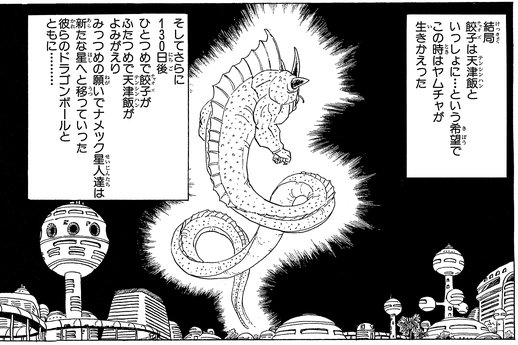 130 Tage später werden die Namekian Dragon Balls wieder mit Energie versorgt und dieses Mal werden der erste und zweite Wunsch genutzt, um Chaozu und Tenshinhan wieder zum Leben zu erwecken. Zu guter Letzt wird der dritte Wunsch genutzt, um die überlebenden Namekian auf ihren neuen Heimatplaneten zu bringen.