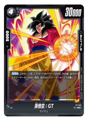 Wenn du beim Spielen keinen Energiemarker hast, kannst du mit dieser Karte 1 Energiemarker platzieren! Dies ist eine superstarke Karte, die perfekt zur Anführerkarte in der Farbe „Schwarz“ [FB03 -104 Son Goku: GT] passt, die Energiemarker gut nutzen kann!