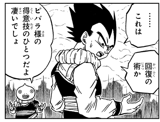 Vegeta war vom Training erschöpft, also heilte Pybara den Saiyajin mit seiner Heiltechnik. Aber laut Pybara sind solche Heilkünste eine anspruchsvolle Angelegenheit, und deshalb beginnt er damit, Vegeta die grundlegendste Fähigkeit beizubringen: die sofortige Teleportation.