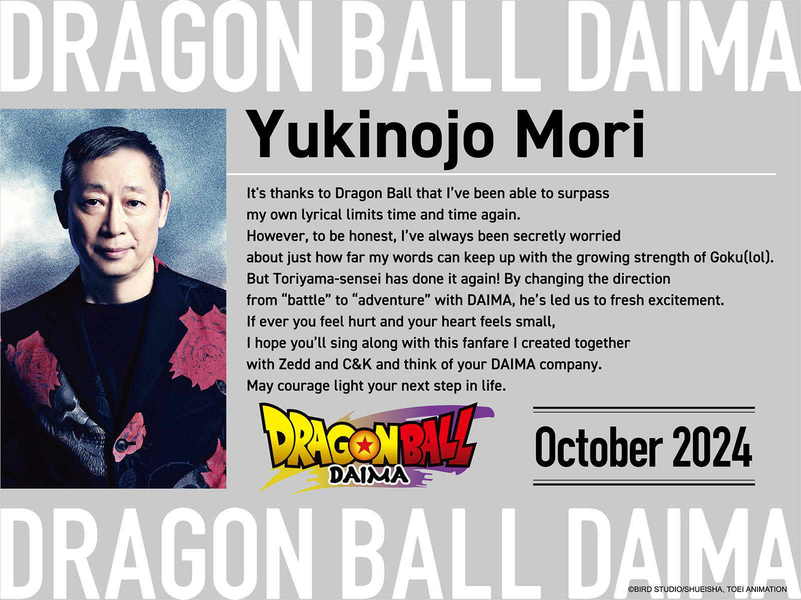 Creator Akira Toriyama worked on the original concept, story, and character designs for the all-new anime series, Dragon Ball DAIMA, and it will begin airing in Japan on October 11th (Fri), 2024. We are now announcing the voice casting for Supreme Kai (Mini) and the new characters, Glorio and Panzy. Moreover, the opening theme song will be a super collaboration featuring Grammy award-winning artist Zedd, Yukinojo Mori, and C&K! Stay tuned for a never-before-seen Dragon Ball!!