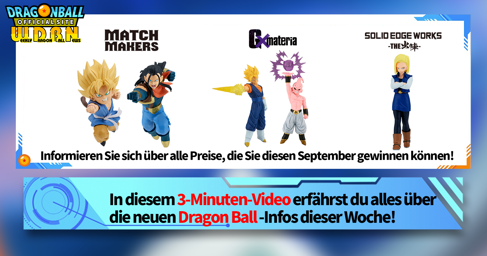 „Weekly Dragon Ball News“ ist eine Videoserie, die jeden Montag (JST) aktualisiert wird, um Ihnen die aktuellsten Nachrichten aus der Welt von Dragon Ball zu präsentieren! Begleiten Sie V Jump Redakteur Victory Uchida, wenn er über die heißesten Neuigkeiten der vergangenen Woche berichtet sowie über aktuelle Updates wie neue Produktinformationen und Site-Neuigkeiten für die kommende Woche!