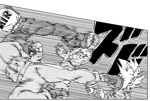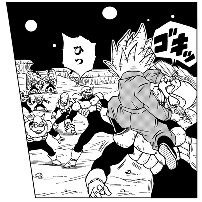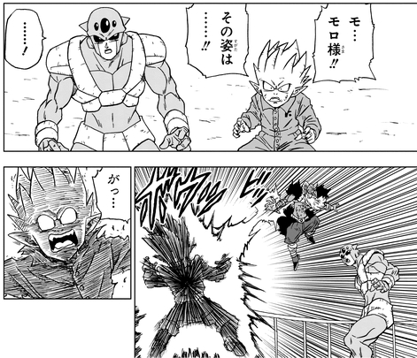 Moro ist nach einem Angriff von Vegeta in einer Zwickmühle und rast zum Raumschiff, um Seven-Threes Kräfte zu absorbieren. Als Shimorekka zu seinem Anführer sagt: „L-Lord Moro!! Du siehst nicht so gut aus!“, zerstört ihr Ziegenführer das Paar!