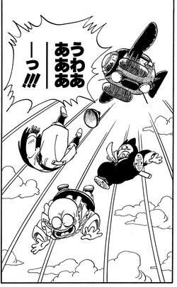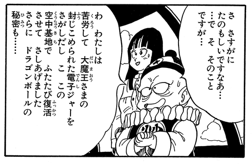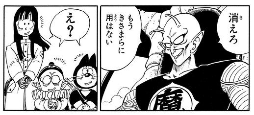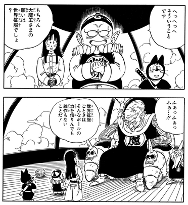 Nachdem der Große Dämonenkönig durch die Dragon Balls seine Jugend zurückerlangt, nimmt Pilaf endlich seinen Mut zusammen und fragt: „In Bezug auf unsere vorherige Vereinbarung … W-wie viel von der Welt wärst du bereit, uns zu vermachen …?“ Der bösartige Piccolo antwortet jedoch nur: „HAU AB. Ich habe keine Verwendung mehr für dich.“ und wirft Pilaf und seine Crew direkt von der Flugbasis!