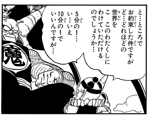 Obwohl er den Great Demon King Piccolo wiederbelebt hat, hat der kleine Pilaf in Wirklichkeit furchtbare Angst vor ihm! Bei seinen ersten Verhandlungen schlägt Pilaf vor: „W-wir haben uns gefragt, ob Sie uns gnädigerweise die Hälfte der Welt schenken würden … heh heh heh …“. Er nimmt diese Idee schnell zurück, nachdem er einen Blick auf das Gesicht des Großen Dämonenkönigs Piccolo geworfen hat, und sagt: „Ähm … natürlich, wenn die Hälfte zu viel ist … wäre WW mit einem Drittel zufrieden. Sogar mit einem Vierten!!“