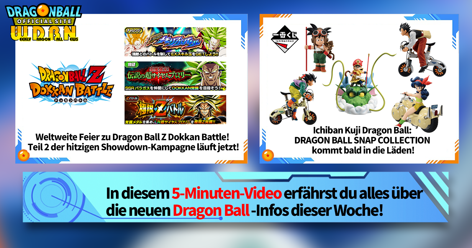 „Weekly Dragon Ball News“ ist eine Videoserie, die jeden Montag (JST) aktualisiert wird, um Ihnen die aktuellsten Nachrichten aus der Welt von Dragon Ball zu präsentieren! Begleiten Sie V Jump Redakteur Victory Uchida, wenn er über die heißesten Neuigkeiten der vergangenen Woche berichtet sowie über aktuelle Updates wie neue Produktinformationen und Site-Neuigkeiten für die kommende Woche!