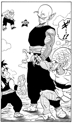 Tenshinhan schlägt ihn mit einem Ellbogenschlag nieder und der Saibaiman wird von Vegeta getötet, während er versucht aufzustehen!