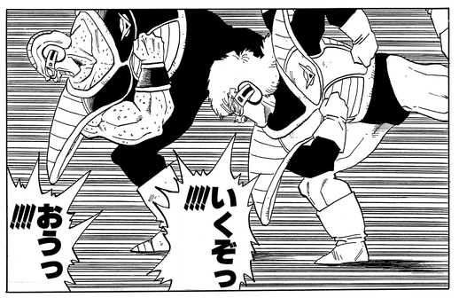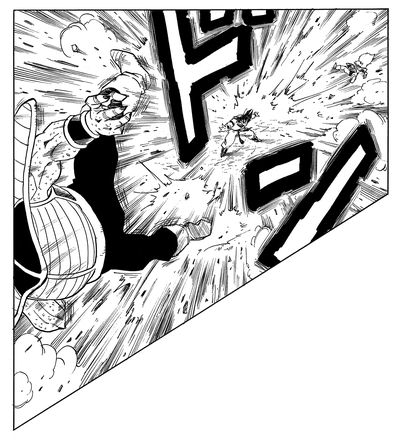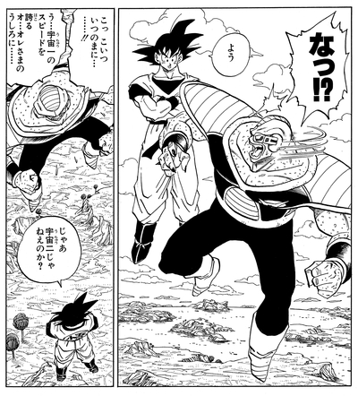 Mit seiner überlegenen Geschwindigkeit kann Goku Burter überraschen und hinter ihn schlüpfen. Als Antwort auf Burters Prahlerei, der Schnellste im Universum zu sein, antwortet Goku spöttisch: „Vielleicht warst du das mal.“