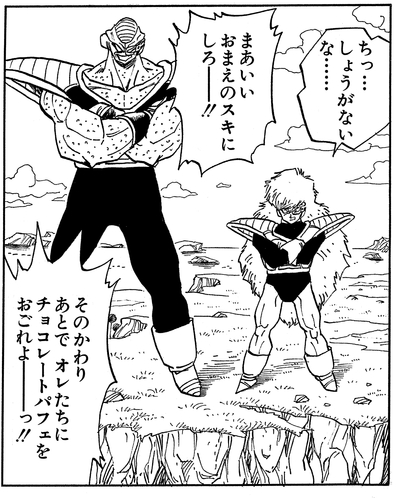 Darüber verärgert verlangt Recoome : „Lass mich auch die beiden Garnelen machen, okay?!“, woraufhin Burter erwidert: „Oh, schön, mach, was du willst!! Aber du musst uns später mit Schokoladenparfaits verwöhnen!“ Wenn man ihn nur ansieht, würde man nie vermuten, Burter so zuckersüß sein kann!