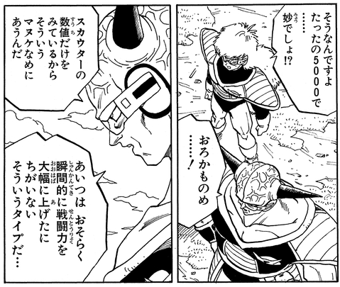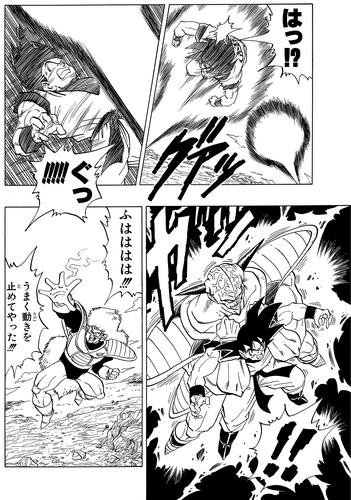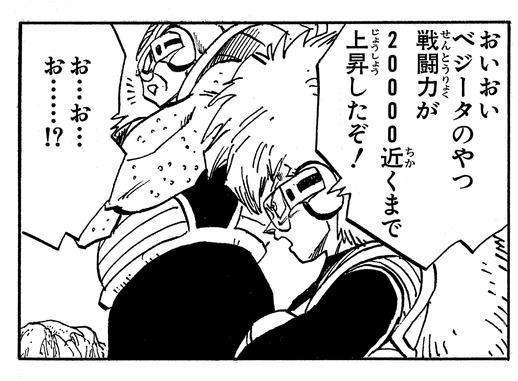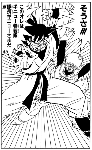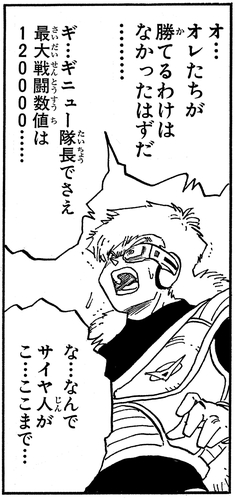 Dann verwendet Goku Kaio-Ken und sein Power Level steigt auf über 180.000, was Ginyu zu der Frage veranlasst, ob Goku der legendäre Super Saiyan sein könnte. Als Jiece dies hört, sagt er schockiert: „Das Einzige …, wovor Meister Frieza selbst jemals Angst hatte?!“
