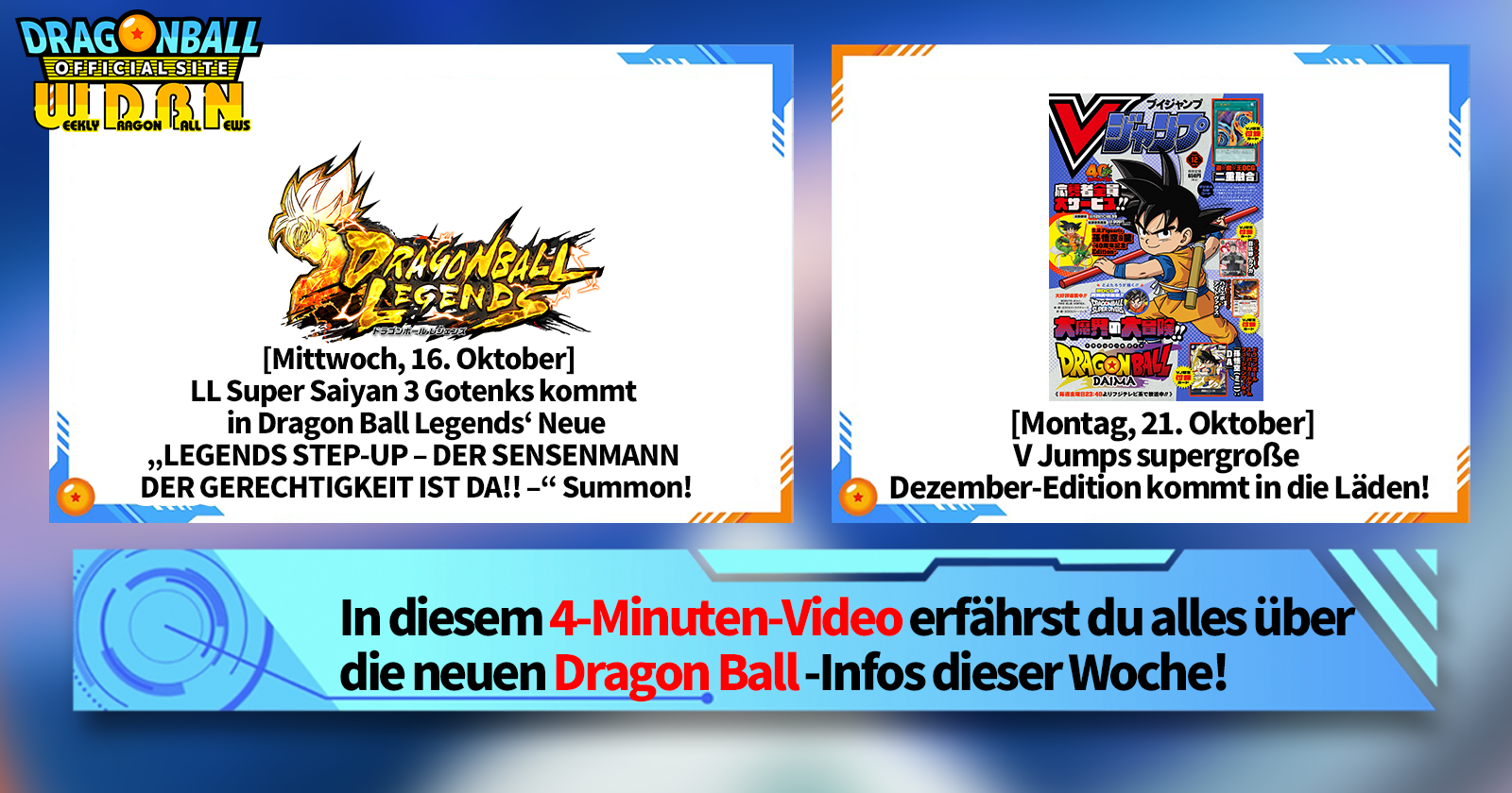 „Weekly Dragon Ball News“ ist eine Videoserie, die jeden Montag (JST) aktualisiert wird, um Ihnen die aktuellsten Nachrichten aus der Welt von Dragon Ball zu präsentieren! Begleiten Sie V Jump -Redakteur Victory Uchida, wenn er über die heißesten Neuigkeiten der letzten Woche berichtet und aktuelle Updates wie neue Produktinformationen und Site-Neuigkeiten für die kommende Woche präsentiert!
