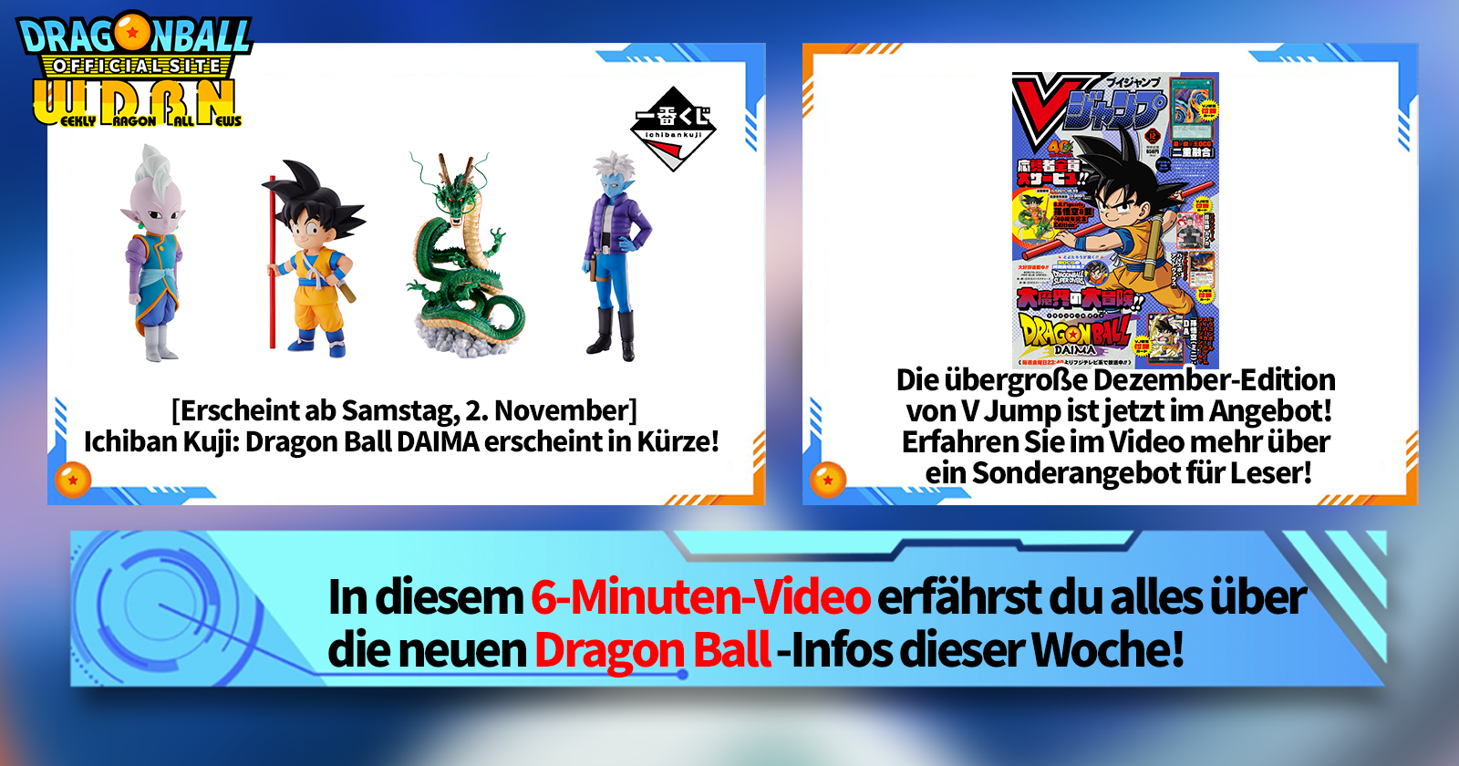 „Weekly Dragon Ball News“ ist eine Videoserie, die jeden Montag (JST) aktualisiert wird, um Ihnen die aktuellsten Nachrichten aus der Welt von Dragon Ball zu präsentieren! Begleiten Sie V Jump -Redakteur Victory Uchida, wenn er über die heißesten Neuigkeiten der vergangenen Woche berichtet sowie über aktuelle Updates wie neue Produktinformationen und Site-Neuigkeiten für die kommende Woche!