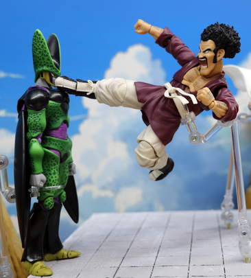 Hier sehen wir, wie Mr. Satan eine mutige Figur macht und seinen typischen Dynamite Kick gegen Cell loslässt!