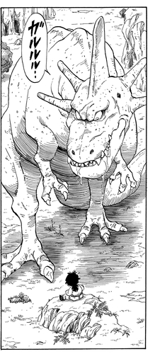 Egal wie oft Gohan entkam, die riesige Echse gab die Jagd nie auf. Sie ahnte nicht, dass ihr potenzielles Mittagessen immer stärker wurde und ihm bald zu viel werden würde! Ironischerweise wurde dem Dino der Schwanz Stück für Stück abgehackt, damit der junge Krieger in Ausbildung sich selbst ernähren konnte!