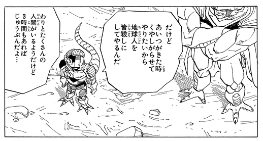 Frieza hätte die Erde leicht in die Luft jagen und Feierabend machen können, konnte aber der Chance nicht widerstehen, Goku in seine Schranken zu weisen. Als er drei Stunden vor Goku auf dem Planeten ankam, beschloss er, alle Bewohner zu töten, um den Saiyan leiden zu lassen.