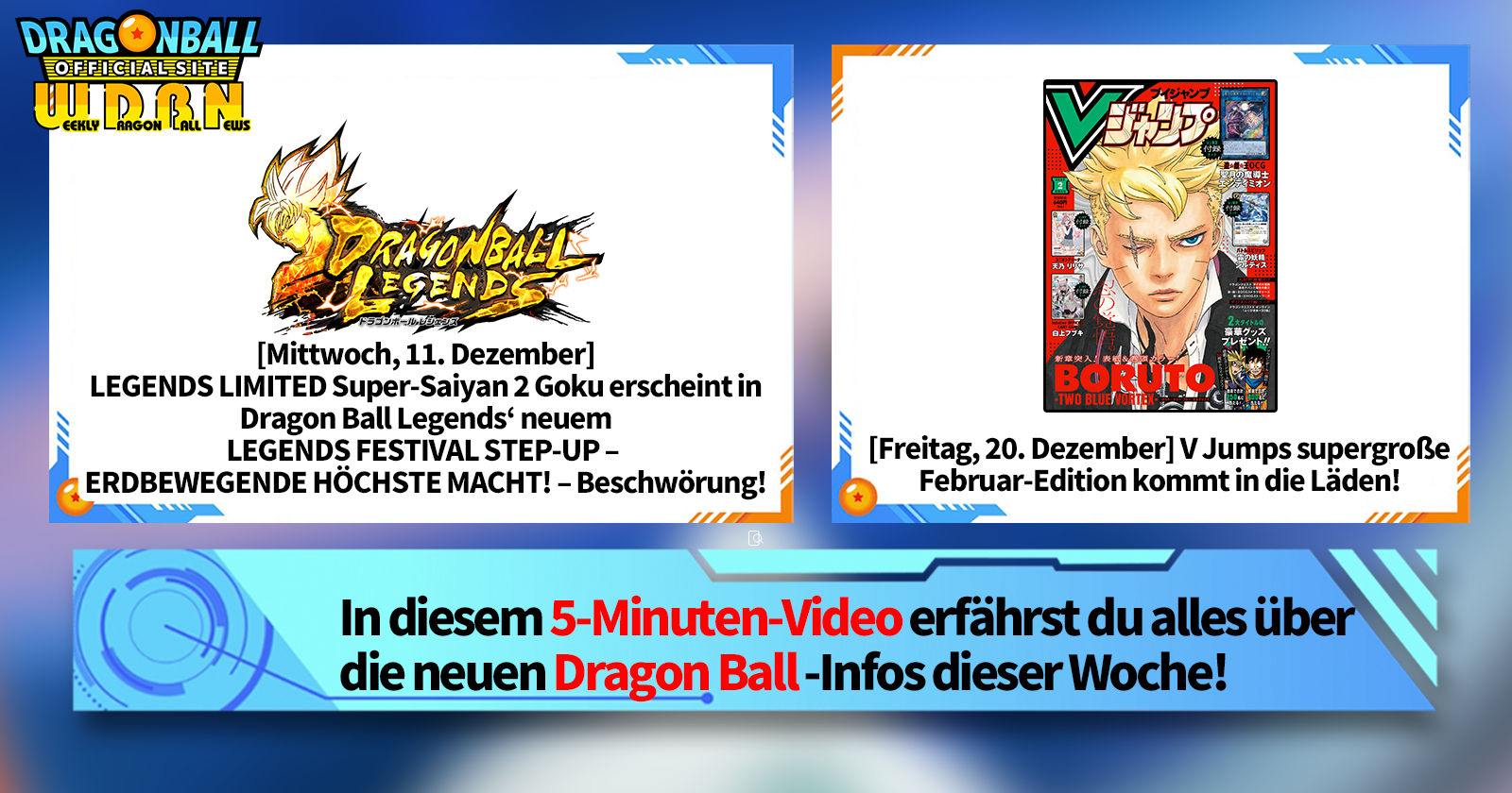 „Weekly Dragon Ball News“ ist eine Videoserie, die jeden Montag (JST) aktualisiert wird, um Ihnen die aktuellsten Nachrichten aus der Welt von Dragon Ball zu präsentieren! Begleiten Sie V Jump -Redakteur Victory Uchida, wenn er über die heißesten Neuigkeiten der vergangenen Woche berichtet sowie über aktuelle Updates wie neue Produktinformationen und Site-Neuigkeiten für die kommende Woche!