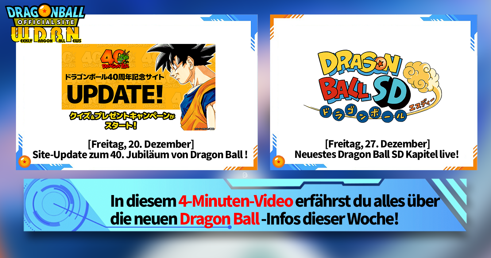 „Weekly Dragon Ball News“ ist eine Videoserie, die jeden Montag (JST) aktualisiert wird, um Ihnen die aktuellsten Nachrichten aus der Welt von Dragon Ball zu präsentieren! Begleiten Sie V Jump -Redakteur Victory Uchida, wenn er über die heißesten Neuigkeiten der vergangenen Woche berichtet sowie über aktuelle Updates wie neue Produktinformationen und Site-Neuigkeiten für die kommende Woche!