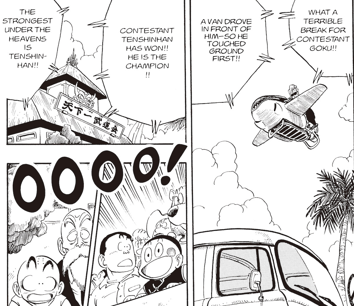 Mit dem Sieg im Visier wird Goku von einem Auto angefahren und fällt vor Tenshinhan zu Boden, was zu seiner Niederlage führt.