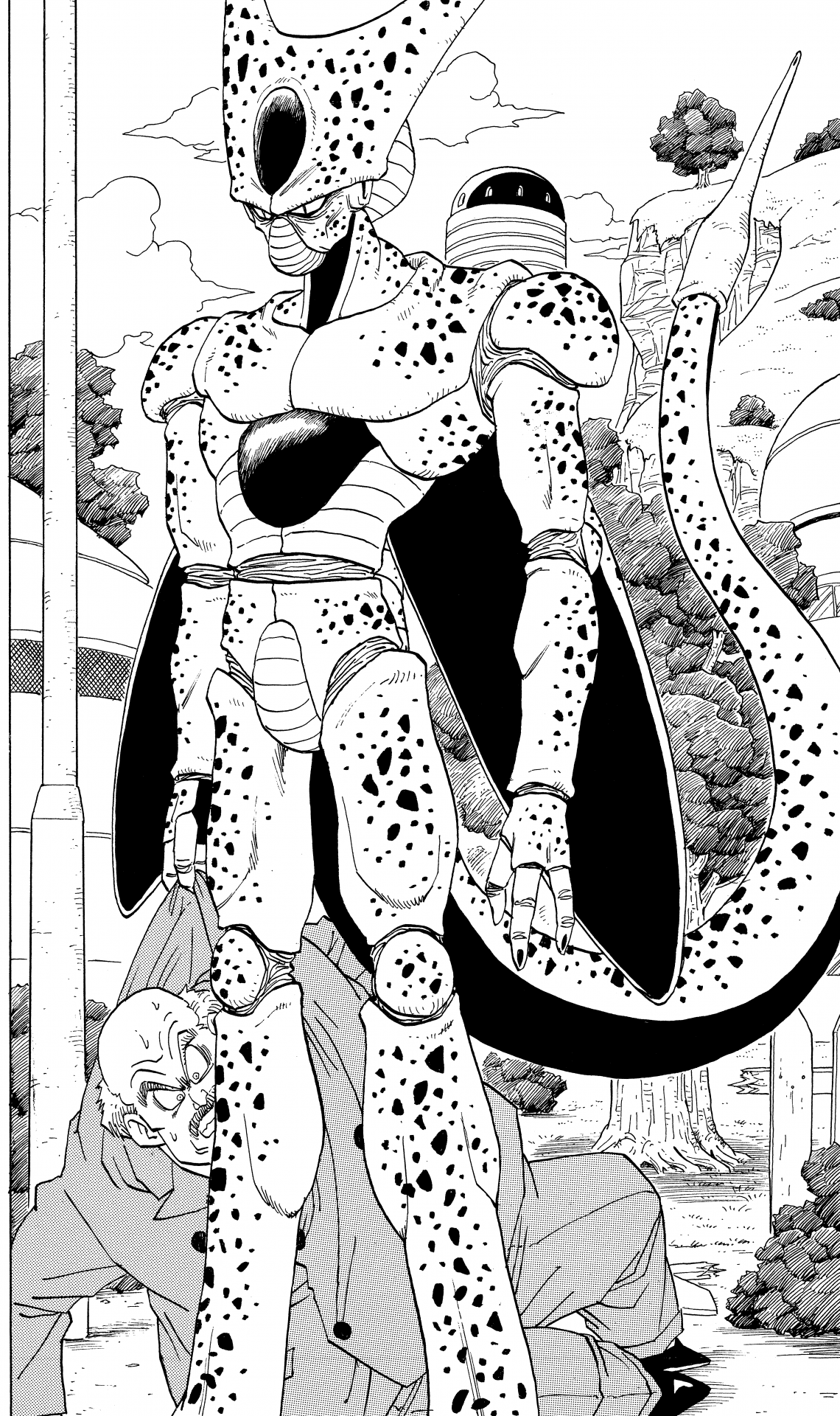 Nachdem er aus seinem Ei geschlüpft und aus der Zeitmaschine aufgetaucht war, die er von Trunks gestohlen hatte, machte sich Cell in seiner ersten Form auf den Weg nach Südosten, und die Bevölkerung von Ginger Town wurde seine ersten Opfer.