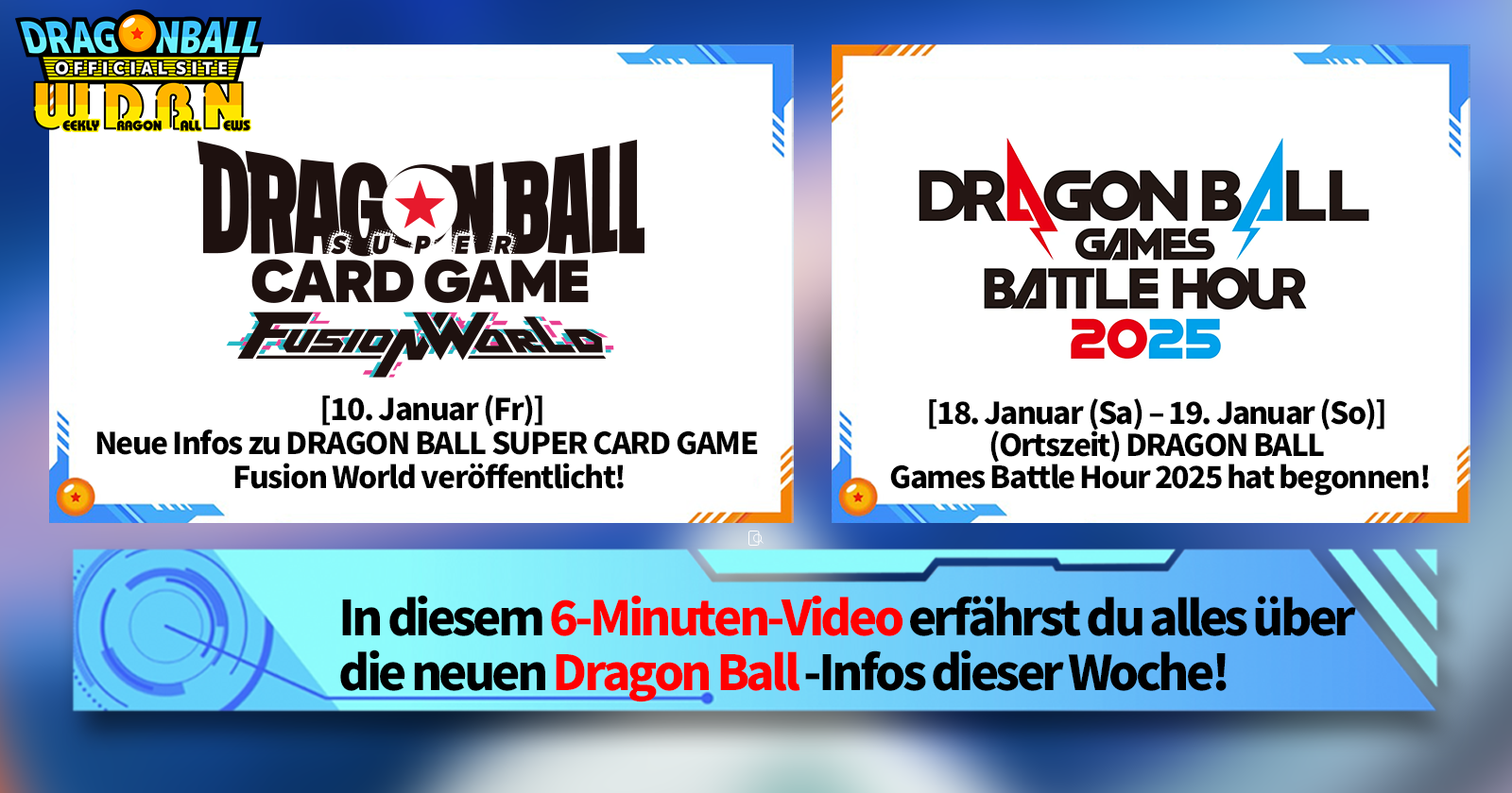 „Weekly Dragon Ball News“ ist eine Videoserie, die jeden Montag (JST) aktualisiert wird, um Ihnen die aktuellsten Nachrichten aus der Welt von Dragon Ball zu präsentieren! Begleiten Sie V Jump -Redakteur Victory Uchida, wenn er über die heißesten Neuigkeiten der letzten Woche berichtet und aktuelle Updates wie neue Produktinformationen und Site-Neuigkeiten für die kommende Woche präsentiert!
