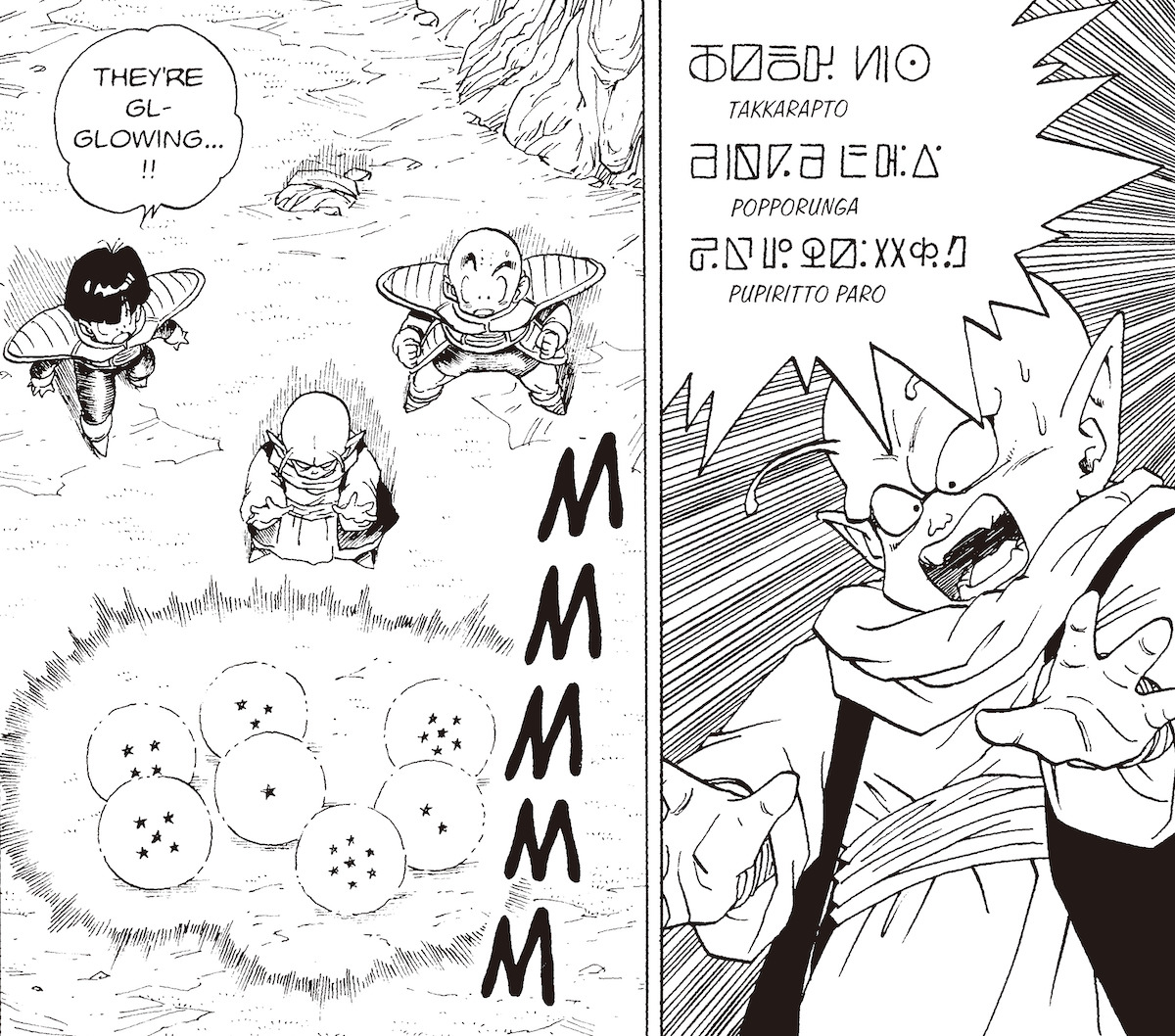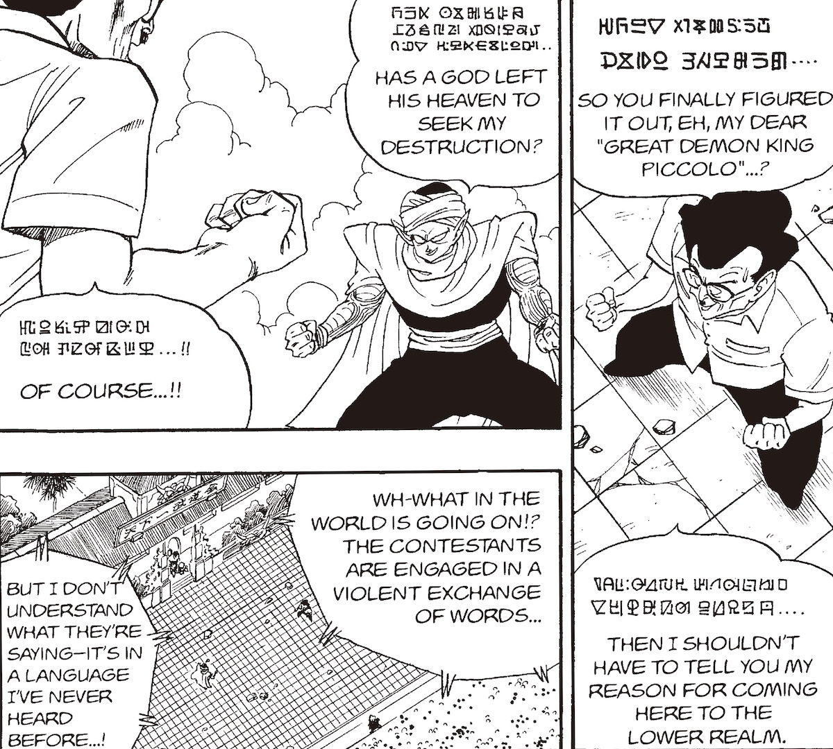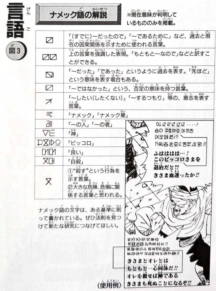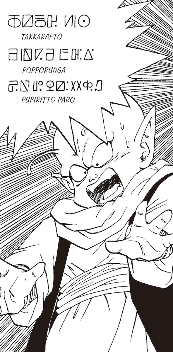 Im Namekian hingegen werden Wörter wie Piccolos Name mit vier Zeichen ausgedrückt, genau wie im Japanischen, und ich nehme an, dass das mit Absicht gemacht wurde. Auf diese Weise hat Akira Toriyama ein Gleichgewicht gefunden: Einerseits hat er eine Sprache geschaffen, über die die Leser tief nachdenken können, da sie nicht einfach willkürlich erschaffen wurde, andererseits ist sie prägnant genug, um gut in einem wöchentlichen Magazinformat zu funktionieren. Das ist wirklich erstaunlich.