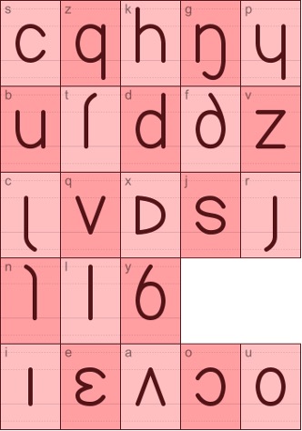 Die Form der Shaleian-Sprache, als sie zum ersten Mal geschaffen wurde. Ziphil erklärte: „Ich habe ungefähr 100 verschiedene Kombinationen geschrieben und dann diejenigen ausgewählt, die dem Charakter am ähnlichsten waren“ (Ziphils offizielle Website)
