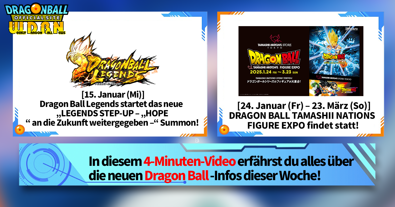 „Weekly Dragon Ball News“ ist eine Videoserie, die jeden Montag (JST) aktualisiert wird, um Ihnen die aktuellsten Nachrichten aus der Welt von Dragon Ball zu präsentieren! Begleiten Sie V Jump -Redakteur Victory Uchida, wenn er über die heißesten Neuigkeiten der vergangenen Woche berichtet sowie über aktuelle Updates wie neue Produktinformationen und Site-Neuigkeiten für die kommende Woche!
