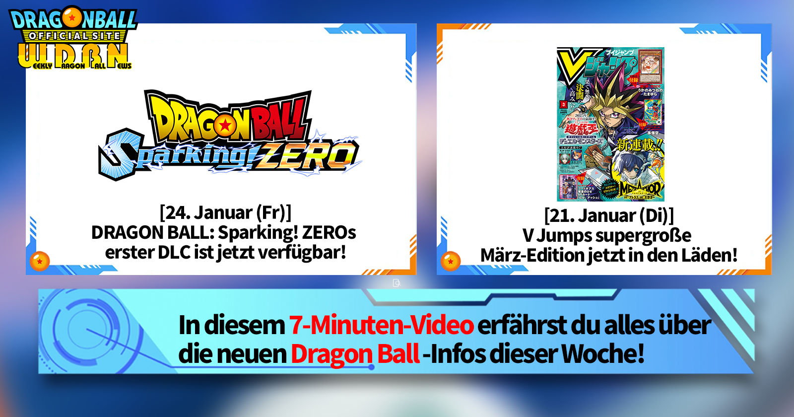„Weekly Dragon Ball News“ ist eine Videoserie, die jeden Montag (JST) aktualisiert wird, um Ihnen die aktuellsten Nachrichten aus der Welt von Dragon Ball zu präsentieren! Begleiten Sie V Jump -Redakteur Victory Uchida, wenn er über die heißesten Neuigkeiten der vergangenen Woche berichtet sowie über aktuelle Updates wie neue Produktinformationen und Site-Neuigkeiten für die kommende Woche!