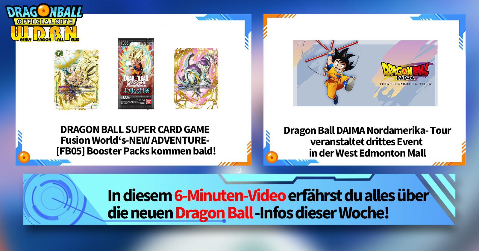 „Weekly Dragon Ball News“ ist eine Videoserie, die jeden Montag (JST) aktualisiert wird, um Ihnen die aktuellsten Nachrichten aus der Welt von Dragon Ball zu präsentieren! Begleiten Sie V Jump -Redakteur Victory Uchida, wenn er über die heißesten Neuigkeiten der letzten Woche berichtet und aktuelle Updates wie neue Produktinformationen und Site-Neuigkeiten für die kommende Woche präsentiert!