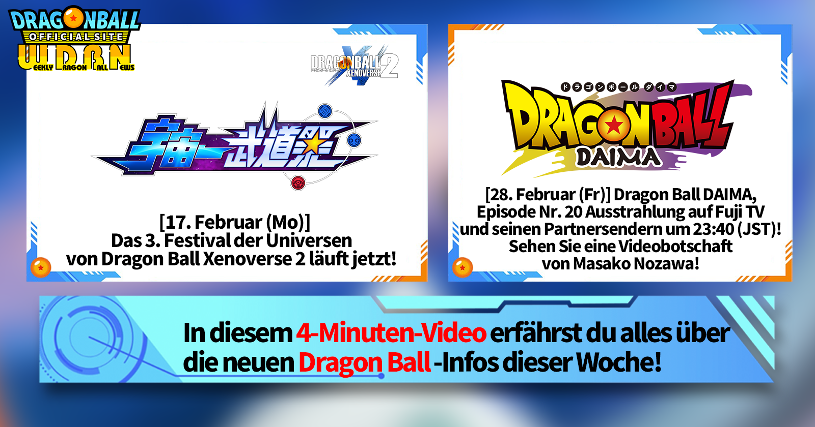 „Weekly Dragon Ball News“ ist eine Videoserie, die jeden Montag (JST) aktualisiert wird, um Ihnen die aktuellsten Nachrichten aus der Welt von Dragon Ball zu präsentieren! Begleiten Sie V Jump -Redakteur Victory Uchida, wenn er über die heißesten Neuigkeiten der vergangenen Woche berichtet sowie über aktuelle Updates wie neue Produktinformationen und Site-Neuigkeiten für die kommende Woche!