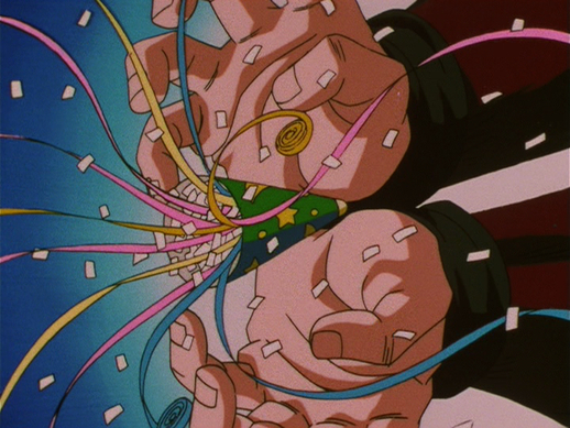 Gogeta teilt sich in fünf Erscheinungen auf und will fünf einzelne Kamehamehas gleichzeitig abfeuern … aber stattdessen beschließt er , Yi-Shinron zu ärgern, indem er fünf Partyknaller abfeuert.
